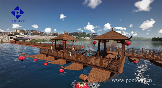 長(zhǎng)廊與亭子的造型采取與當(dāng)?shù)亟ㄖ嘟y(tǒng)一的翹腳設(shè)計(jì)。浮箱部分采取舟體作為載體,更具古典風(fēng)味,船頭和船尾的設(shè)計(jì)遵循了當(dāng)?shù)氐慕ㄖ厣c屋頂?shù)穆N腳極為類似,與周圍建筑環(huán)境完美結(jié)合,形成一個(gè)統(tǒng)一。