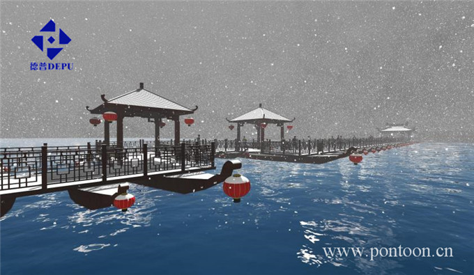 整座浮橋不僅極具特色更具文化背景熏陶,尤其舟體兩邊的燈籠晚上照亮整個(gè)湖面,在水中的倒影更是一道美麗的風(fēng)景。大雪紛飛的冬天,浮橋與涼亭及廊亭在雪中若隱若現(xiàn),給人一種幽深的感覺,仿若仙境,意境優(yōu)美,更有詩意。