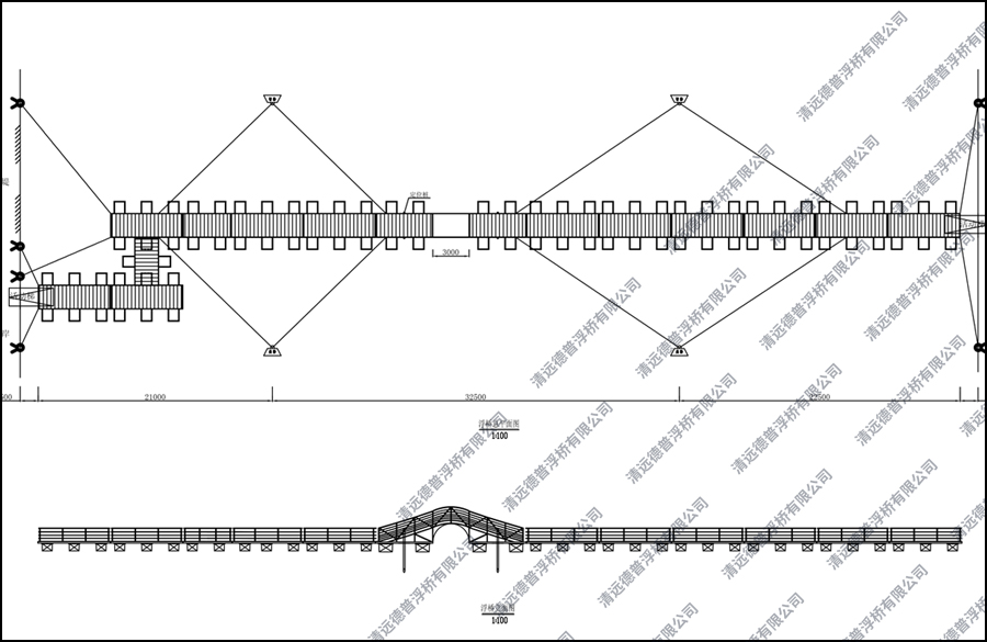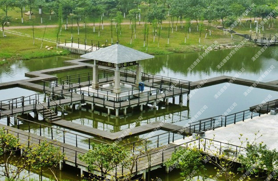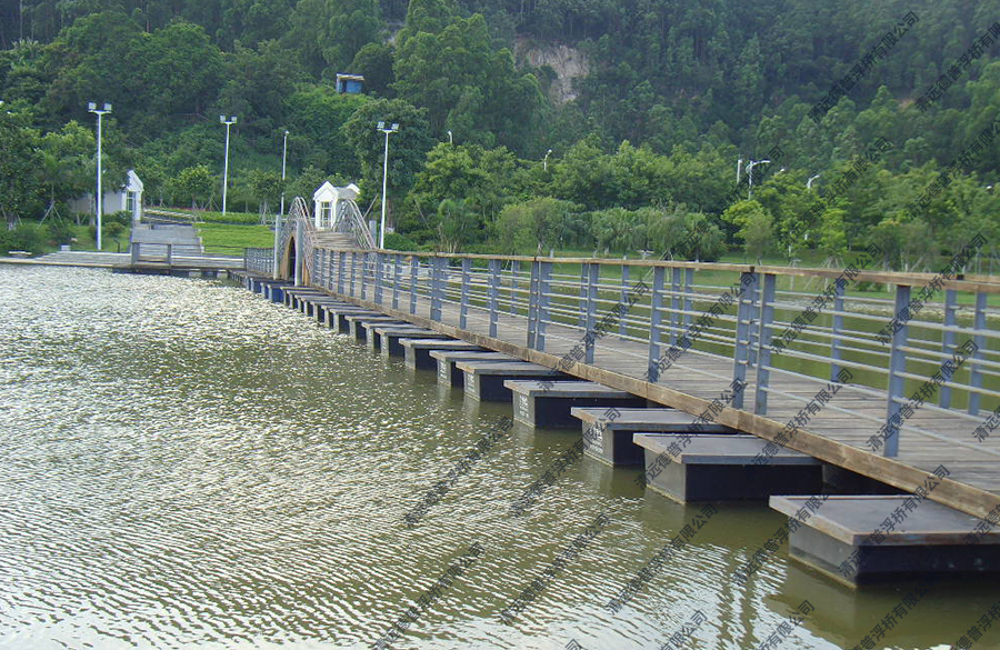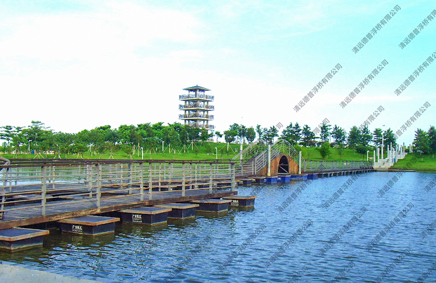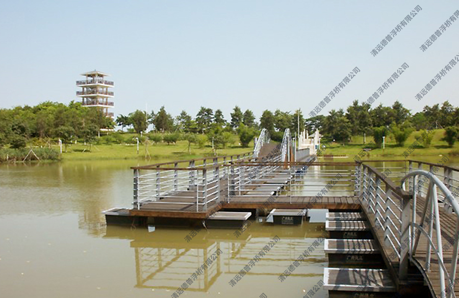 貫穿水域兩岸是一條景觀步道(浮橋),可直通兩岸的風景區。該景觀步道設計最大荷載250公斤/平方米,水位落差1米,全長82米,寬2.5米,采用拋錨和定位樁兩種方式固定,中間采用拱型結構。有利于水域內中游樂船只的通行,提高水域的使用率和游樂性,安全平穩,氣勢恢宏,景觀效果好,該工程設計、建造均由清遠德普浮橋有限公司負責完成。