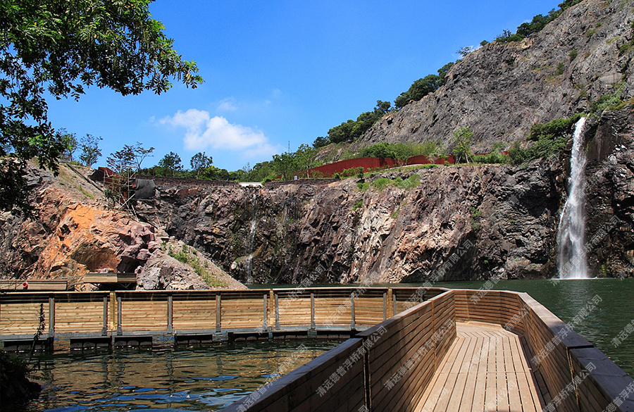 辰山礦坑花園景觀浮橋位于上海植物園西北角,通過綠環道路和辰山河邊主路與整個植物園相連。景觀浮橋是礦坑花園的主要通道,全長約160米,寬1.6米,整座浮橋采用模塊結構,由特制浮箱、鋼結構和進口防腐木面板組成。浮橋緊帖在低于地平面30米的水平面上,行走在上面宛如走在水面上,此時身邊的峭壁恍惚要倒塌,加上浮橋的小小的搖搖晃晃感覺,別具匠心,站在這座沉床式花園浮橋中間,峭壁環生,瀑布飛泄,加上水杉林遮住了陽光,此刻恍如絕境。走完浮橋是個黑乎乎的山洞,鉆過山洞再見天日,不禁感嘆礦坑花園的神奇。