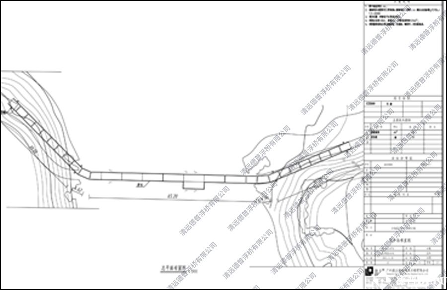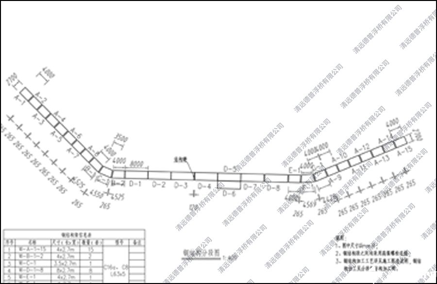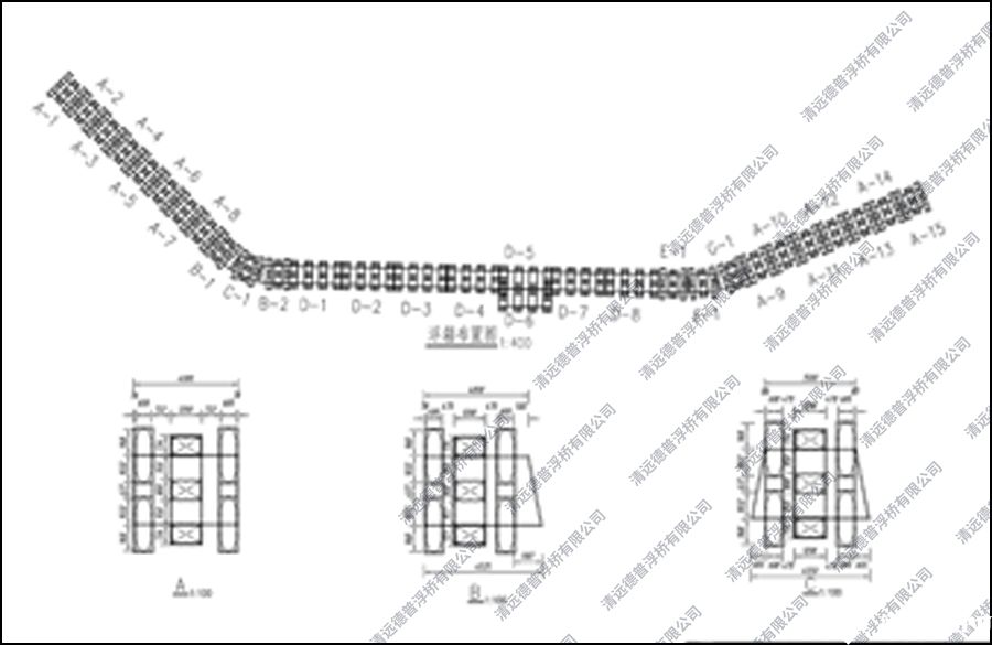 項(xiàng)目地形復(fù)雜,設(shè)計(jì)浮橋成S字形,采用落地式和浮動(dòng)式而結(jié)合,來滿足浮橋正常使用和水位落差。