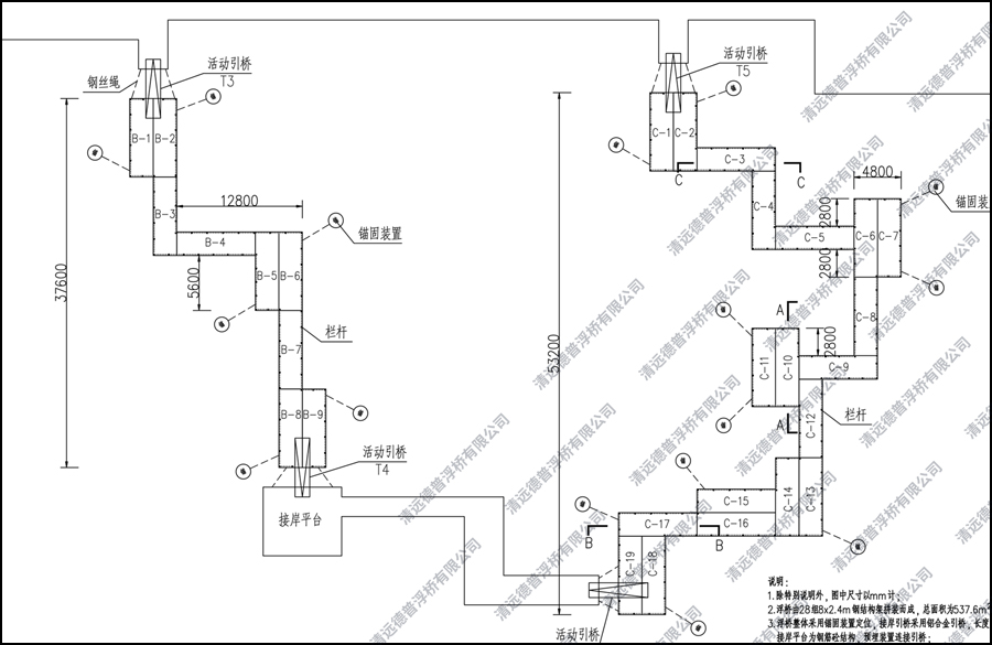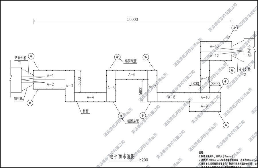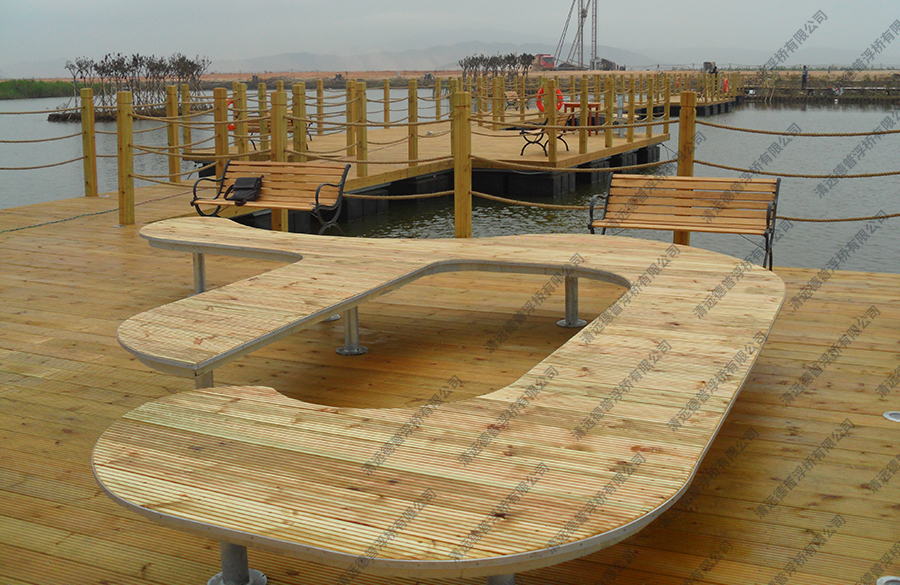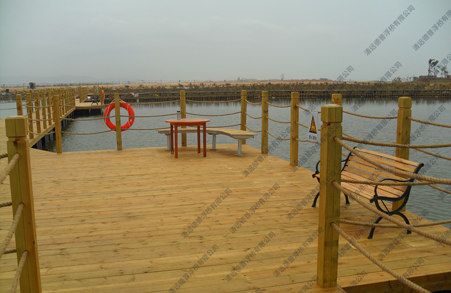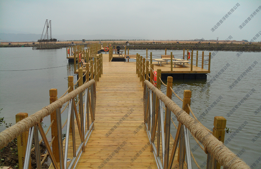 珠海橫琴浮橋長120米,項目從設計到施工,12天內完成,創下行業內新 速度,德立這一壯舉是堅持自主創新、自主知識產權的獨具風格,該橋的設計主要是采用鋼結構受力件、防腐木板及PE塑料浮箱等材料制作而成,設計受載300公斤 / 每平方米,最大落差 2.0 米 ,浮橋兩側設有水上平臺可供游客觀賞及休息,全面體現了設計的人性化及完美度。