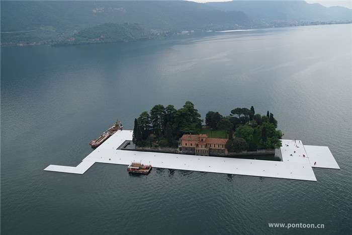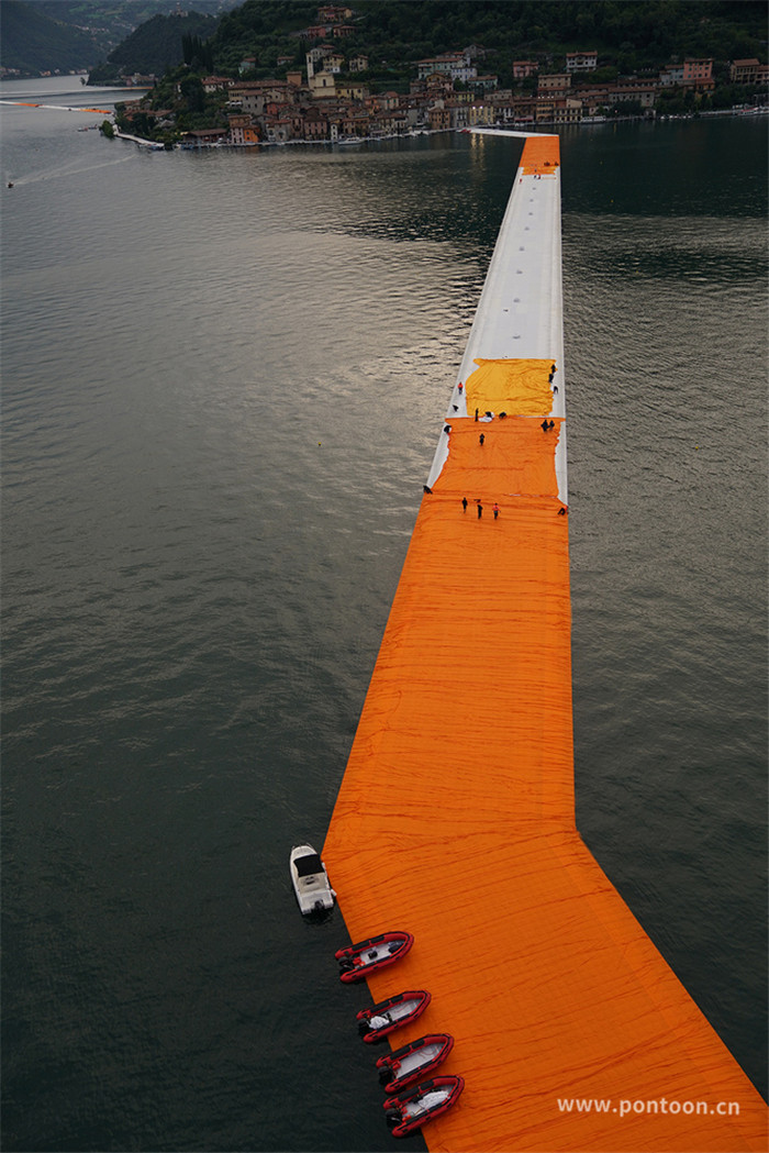該浮橋工程由包裹著100,000平方米黃色布的三公里長的走道組成,該走道由一個由220,000個高密度聚乙烯立方體組成的浮橋系統支撐。這些元素隨著湖泊的波浪運動而自然波動。