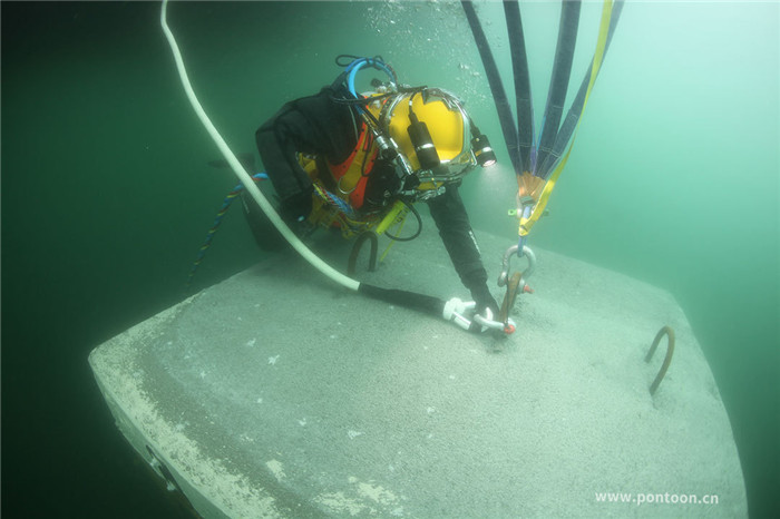 一名潛水員將一根超高分子量聚乙烯制成的繩索連接到一個斷裂的20公噸聚酯保護層上,并將其與湖床上的一個錨點相連,以將碼頭保持在地點。