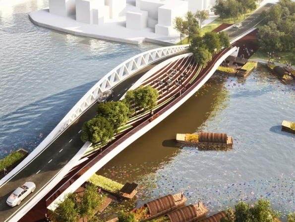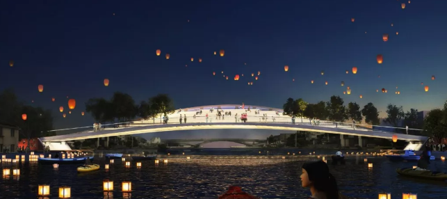 MVRDV 的設計方案名為“黎明之橋”,它坐落于朱家角的熱門景點、始建于 1571 年的放生橋西側 500 米,將橫跨淀浦河,聯結起新住宅開發區和朱家角鎮邊緣,與核心景區相比更為安靜的區域。