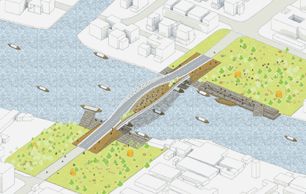 MVRDV 考慮到河床快速變化,這座橋長約 80 米,寬 24 米,采用無立柱的設計,為來往船只留下空間。橋身將采用與周圍環境一致的色彩和材料,回應當地白墻房屋的白色橋梁結構,搭配淡紅色的木質地面和樓梯平臺。
