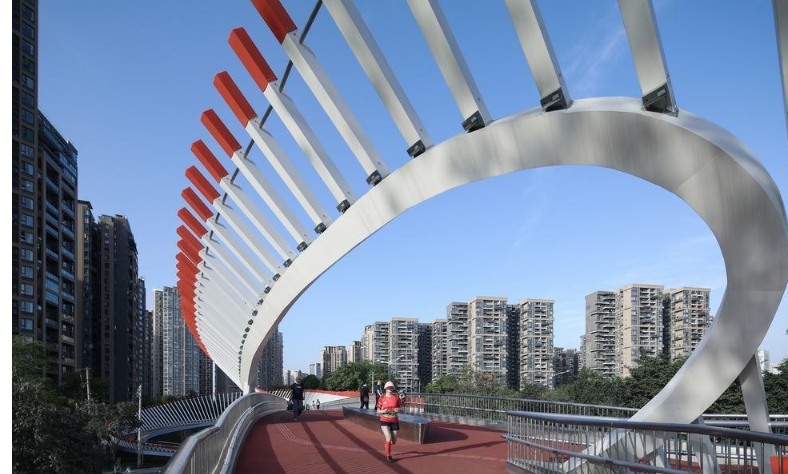 該橋橫跨天府二街,主橋正對(duì)著大源中央公園的綠道